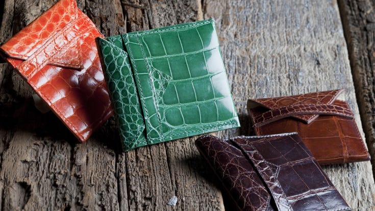 Each wallet is cut from a giant alligator skin 10 to 12 feet long.